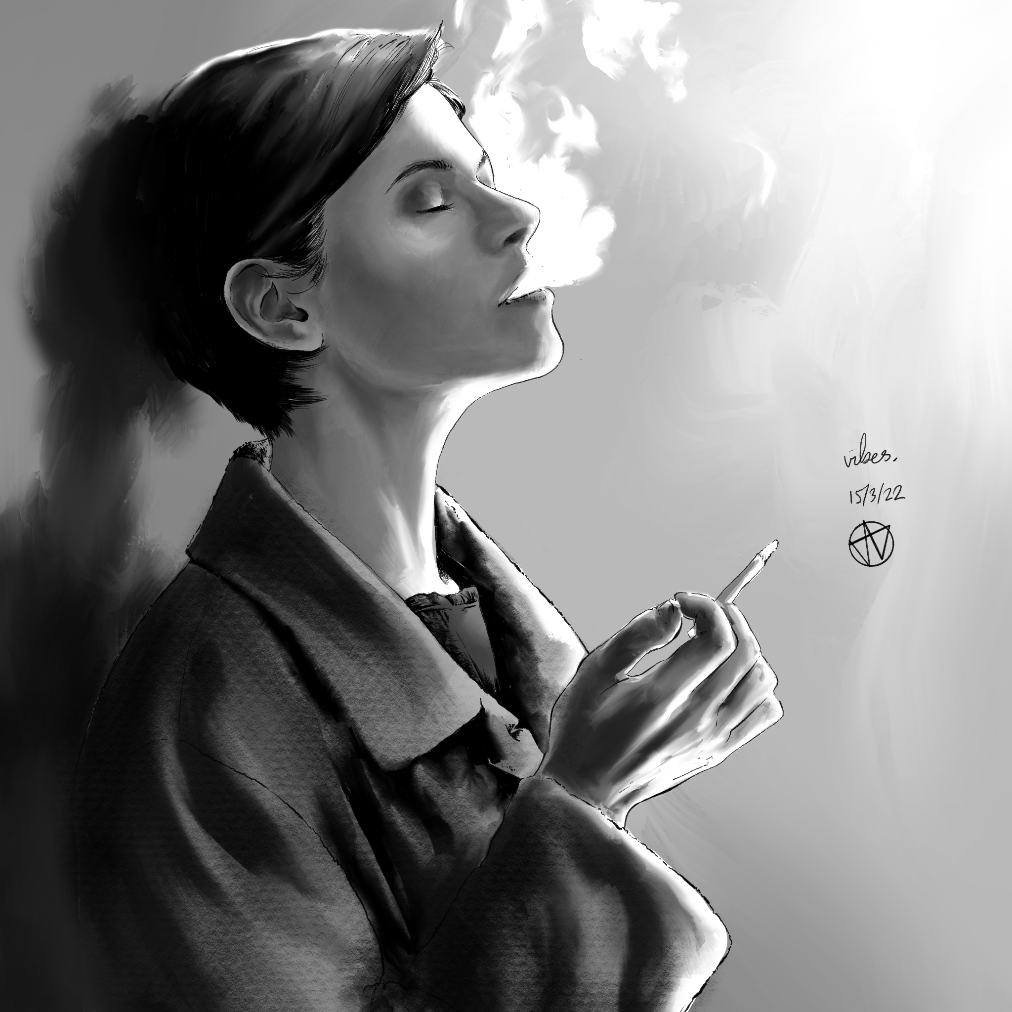 A black and white or greyscale piece, created digitally. Prices start at £99 for a PDF sent direct to the client.